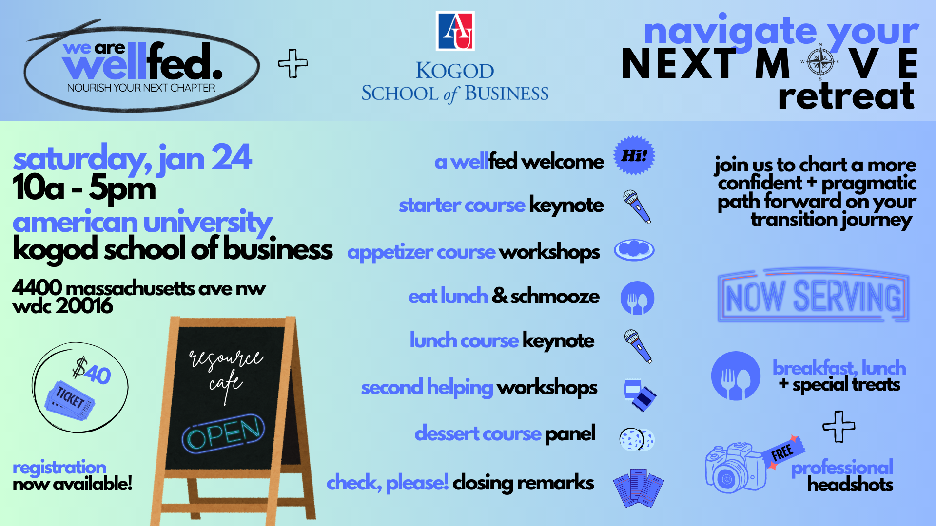 our 3rd ‘navigate your next move’ retreat will take place at at the kogod school of business at american university.